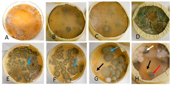 Fungal colonies cultivated from settled dust sampled before (upper row) and after (lower row) the ventilation improvement. Panels (A–C,E–G) are cultures from dust samples collected from Classroom 2. Panel (D) is a culture from dust collected in the lobby, while Panel (H) is a dust culture from Classroom 1. The dust samples were cultivated on MEA and incubated for four weeks at room temperature. The plates in Panels (A,D) contained over 100 green, Trichoderma-like colonies. Colonies in Panel D overgrew the other fungal colonies within two weeks of incubation indicating potential mycoparasitism. The plates in Panels (B,C) were overgrown with Rhizopus-like colonies. The plates in the lower row (Panels (E–H)) contained mainly green Penicillium colonies (blue arrow). The plates in Panels (G,H) contained yellow Aspergillus colonies (black arrow), a black Aspergillus colony (white arrow), and a green Eurotium/Aspergillus colony (red arrow).