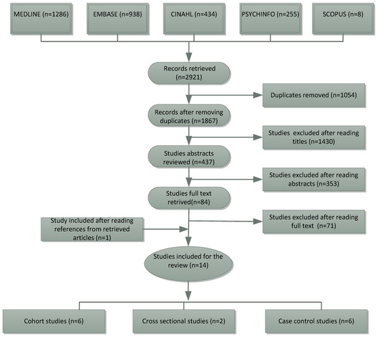 A total of 2921 articles were retrieved from the five databases. After applying the selection criteria at each screening stage, a total of 14 articles were retained (Figure 1).