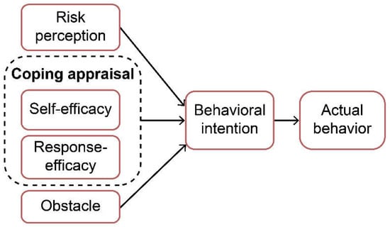 Protection Motivation Theory (PMT)—a health promotion model—states that some form of risk information can provide the impetus for an individual to determine the degree of risk severity, their vulnerability, and their ability to reduce that risk. PMT was first proposed by Rogers [] in 1975 (and revised in 1985) to describe the mechanisms people use to adopt protective behaviors and reduce perceived threats. It explains that a cognitive process informs the efforts taken to protect oneself from harm and can be used to analyze both maladaptive behavior and adaptive response. For example, maladaptive responses are those that place an individual at health risk by either engaging in a health behavior risk (e.g., smoking) or not adopting a protective behavior or adaptive responses (e.g., getting vaccinated). PMT posits that health protection behaviors and disaster preparedness intentions are motivated by the same principles. Therefore, Grothmann and Patt [] suggest that PMT can be used to explore disaster preparedness behavior. Thus, PMT has become one of the most widely applied disaster prevention decision-making models []. Related studies have explored threat appraisals among people that considered (1) the severity of the threat (individuals’ estimates of likely harmful consequences and severity) and (2) the probability that the threat would come to pass (the probability that individuals would incur damage from a particular threat). When people appraise a threat, they come to realize the existence of certain risks. Therefore, threat appraisal is also referred to as risk perception []. Self-efficacy and response-efficacy are essential components of an effective coping strategy [] and refer to the existing levels of individuals’ abilities in relation to the recommended level of disaster preparedness and its effectiveness []. Furthermore, behavioral intentions may be influenced by both an individuals’ appraisal of a threat and their ability to cope.