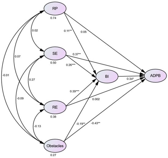 Structural equation modeling of the hypothesized model. * p ≤ 0.05. ** p ≤ 0.01. *** p ≤ 0.001; RP = risk perception; SE = self-efficacy; RE = response efficacy; BI = behavioral intention; ADPB = actual disaster preparedness behaviors.