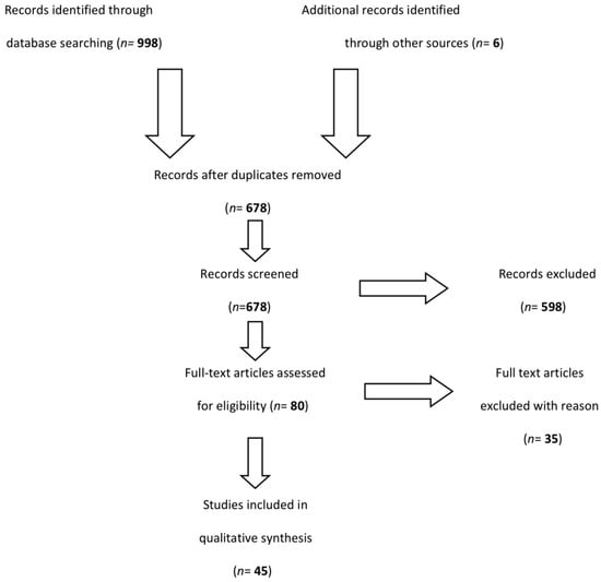 As shown in Figure 1, a total of 998 abstracts were screened through the initial database searches. After duplicates were removed, a total of 678 reports were obtained and full texts were screened with a brief examination of titles and analysis of abstracts. Of these, 77 articles were identified as potentially relevant, and 45 were included in the qualitative synthesis based on the consensus of at least two authors. We gathered data from the initial 77 articles using a template form in Microsoft Excel, according to study characteristics, geographical area of interest, and results.