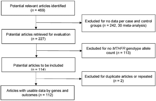 Based on the inclusion/exclusion criteria, we first identified 469 articles. A total of 242 articles were excluded because they lacked the data for the genotypes per case and control groups. Another 113 articles were eliminated due to missing or incomplete genotype allele counts. We also removed two articles because each of them reused datasets that were in another included article [30,31]. As a result, we included 112 articles, with 123 studies in the final analysis (Figure 1). Eleven additional studies are described in the following section. Four articles (Supplementary Materials reference list, 37, 51, 69, and 79, following Supplementary Materials Table S1) included both gender groups of male and female, yielding 4 additional study groups; an article (Supplementary Materials reference list, 78) included 2 IHD types (CAD and MI), yielding 1 additional study group; an article (Supplementary Materials reference list, 89) included racial-ethnic groups of African and Caucasian, and gender groups of male and female, yielding 3 additional study groups; an article (Supplementary Materials reference list, 91) with MI included two diabetes mellitus (DM) groups (with DM and non-DM), yielding 1 additional study group; an article (Supplementary Materials reference list, 93) with MI included gender groups of male and female, yielding 1 additional study group; and an article (Supplementary Materials reference list, 130) with CAD included gender groups of male and female, yielding 1 additional study group.