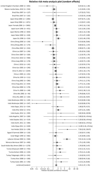 To identify sources of heterogeneity, subgroup analysis per ethnic groups showed that MTHFR 677 TT and CT genotypes were associated with IHD risk. The ranking of IHD risk with the MTHFR 677 TT genotype from high to low according to ethnic groups was Middle Eastern (RR = 2.62), African (RR = 2.14), South Asian (RR = 1.51), and East Asian (RR = 1.31); and with the CT genotype, the ranking of risks was South Asian (RR = 1.32) and Middle Eastern (RR = 1.18) (all p < 0.01). It is worthy to point out that the Middle Eastern and African samples had RR > 2, and, as in biological studies, RR > 2 could infer causality [33,50,51,52]. On the other hand, the MTHFR 677 CC wildtype played a protective role against IHD and ranked as follows: Middle Eastern (RR = 0.76), East Asian (RR = 0.84), and South Asian (RR = 0.91) (all p < 0.01) (Table 2). For the subgroup analysis by countries, we further examined whether MTHFR 677 TT genotypes posed a risk (RR > 1), were protective (RR < 1), or had a mixed effect (RR ~ 1) (Table 2). The countries that had MTHFR 677 TT as a risk genotype included Australia, European countries (Poland, Russia, Slovakia, Sweden, Croatia, Czech Republic, Netherlands, Switzerland, France, Portugal, United Kingdom, and Ireland), Canada, South America (Brazil and Mexico), Asian countries (Japan, China, and India), Middle-Eastern countries (Israel, Turkey, Iran, Egypt, Saudi Arabia, and Lebanon), and African countries (Tunisia and Morocco) (Supplementary Materials Figure S2a). It is worthy to point out the countries with RR > 2 because, as in biological studies, RR > 2 could infer causality [33,50,51,52]. These countries with elevated risks included India, Turkey, and Tunisia (Figure 2, forest plots). In Figure 2, six studies from India presented a very wide range of the 95% confidence interval (CI) (Supplementary Materials reference list, 125–127, 129, and 130, with both gender groups of male and female), with four studies presenting zero counts on the MTHFR 677 TT genotype in their control groups, and two studies (Supplementary Materials reference, 130, included two gender groups of male and female) presenting zero counts on the MTHFR TT genotype in the case groups. The countries that presented MTHFR 677 TT as a protective genotype (RR < 1) included three European countries (Hungary, Italy, and Spain), one Central American country (Costa Rica), two Asian countries (South Korea and Pakistan), and South Africa (study population consisted of descendants of Indian immigrants) (Supplementary Materials Figure S2b). For Germany, United States, and Taiwan, the MTHFR 677 TT genotype presented a mixed IHD risk (Supplementary Materials Figure S2c).