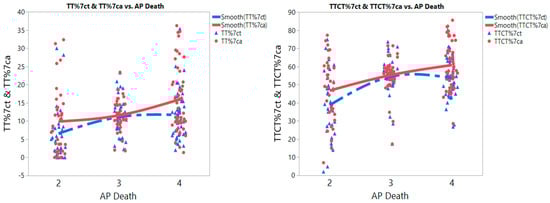For meta-prediction, we performed both a partition tree analysis and a Tukey’s test to examine the potential interaction between independent variables, such as levels of air pollution as measured by the death rates associated with air pollution per country (AP), source of controls, and the quality score, with outcome variables of MTHFR polymorphisms and IHD risk. We did not find significance with other factors except for the AP on the interaction between polymorphisms and IHD risks. The annual AP by country was reported and classified by the World Health Organization (WHO) using the following criteria: (1) Level 2 = 51–100 deaths/million population (DMP); (2) Level 3 = 101–250 DMP; and (3) Level 4 = 251–400 or greater DMP [49]. We present the partition tree (split groups) and Tukey’s test results side by side for the MTHFR 677 genotypes and AP (Table 3). The meta-prediction using the partition tree and the Tukey’s tests were not performed for the MTHFR 1298 genotypes because that genotype was rarely studied to date. There were significant increases in the percentages of MTHFR 677 TT and CT polymorphism between AP levels 2 and 3 (p < 0.05), and levels 2 and 4 (p < 0.01) for both the case and control groups. The partition tree results, depicted in Table 3, indicate a clear and consistent pattern: No matter what the variable is (TT%ct, TT%ca, CT%ct, CT%ca, etc.), the mean percent of polymorphisms of TT or CT were lower with lower levels of AP death, and increased with higher levels of AP death. In addition, strikingly higher polymorphisms were noted as AP rates increased for the IHD case group as compared to the corresponding control group. In contrast, the percentages of the MTHFR 677 CC wildtype decreased with increased levels of AP death for both the case and control groups. The risks of IHD from MTHFR 677 TT plus CT polymorphisms presented a greater risk with lower levels of AP death, and was significantly higher between AP levels 2 and 3 (p < 0.001), and levels 2 and 4 (p < 0.05). It is important to point out that, unlike ANOVA, in which levels are grouped by the analyst, the partition done by the decision tree is data-driven i.e., the algorithm determines what partition could result in better purity (homogeneity), meaning that the associational pattern is less likely to be a statistical artifact capitalized on chance. The nonlinear curves were further revealing of the differences on the percentage of MTHFR polymorphisms at different AP levels (Figure 3). With a change in AP levels from low (Level 2) to high (Level 3 and 4).