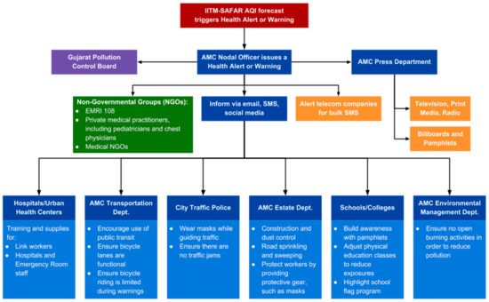 Flowchart demonstrating the array of stakeholders necessary to disseminate and act on an AQI advisory in Ahmedabad.