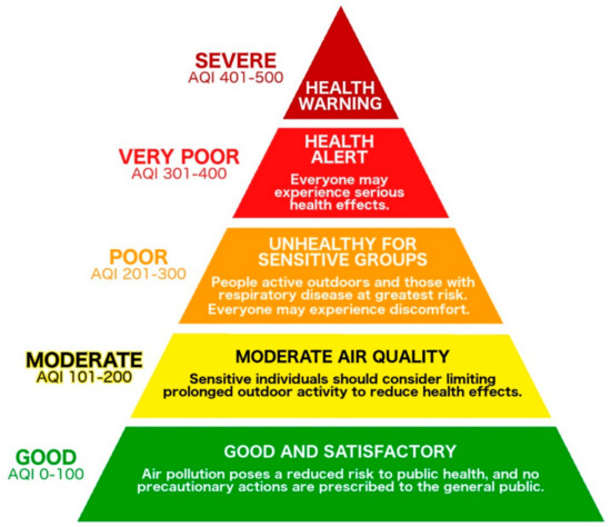 CPCB established a national AQI system in 2015 in 14 cities, and that index now summarizes air quality in 57 cities [27,112]. In addition to AQI systems administered by the CPCB and IITM, other countries have implemented their own systems to protect their citizens working in the country. For example, the U.S. embassies and consulates in New Delhi, Mumbai, Kolkata, Hyderabad, and Chennai have deployed the U.S. EPA-certified instruments and calculation methods to convert raw PM2.5 readings into an AQI value that helps to inform the public about air quality-related health risks [141,142]. These AQI data and health effects advisories are continuously updated online [143].