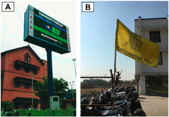 Cities are increasingly working to disseminate information on air pollution levels and associated health risks with the aim of reducing harmful exposures at the population level [19,20,21]. One key tool to communicate such data is the air quality index (AQI), which summarizes air quality conditions in a single metric and distills information on associated health risks in a way that is accessible to the public [22,23]. Recent research indicates that AQI systems, when accompanied by emissions reductions on the most polluted days, could help cities achieve cleaner air and tangible health benefits [24]. In 2015, a steering committee organized by the Ministry of Health and Family Welfare issued a comprehensive report that examined India’s air pollution problem from a public health perspective. The report recommended the deployment of both AQI systems and targeted health messaging at the local level as a strategy for addressing the significant health risks posed by polluted air [25]. At the state level, the Gujarat Pollution Control Board (GPCB) is active in addressing air pollution and is developing a long-term clean air plan [26] in parallel with the Ministry of Environment, Forests, and Climate Change (MOEFCC) National Clean Air Programme on air pollution monitoring and control [27]. Complementing these efforts, the city of Ahmedabad is among the first cities in India where city leaders, state government, and civil society are proactively working together to address the air pollution challenge through an exposure mitigation plan centered upon an AQI [28,29,30].