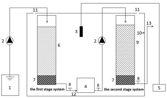 Schematic diagram of the simulated two-stage column CRI. 1: Feeding tank (V = 5 L); 2: Peristaltic pump; 3: Thermometer; 4: Tank to add a carbon source (V = 1 L); 5: Temperature controller; 6: Filling medium; 7: Support layer; 8: Valve; 9: Saturated section; 10: Insulation mantle; 11: Air hole; 12: Effluent outlet of the first stage; 13: Effluent outlet of the second stage.