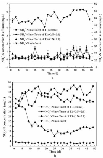 3.1. Effect of C/N Ratio on Removal Efficiency of Ammonium and Nitrate