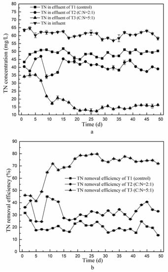 Initially, the TN concentrations in the second-stage effluent of all three experiments were above 35 mg/L during the first 5 days (Figure 5a), which indicates a relatively poor nitrogen removal performance at this early stage of the experiments. Possibly, the denitrifying bacteria in the second phase need time to adapt to the new conditions applying after addition of an external carbon source. From day 9 onwards, the TN concentration in the second stage effluent of T2 and T3 decreased, to 34.2 mg/L and 21.9 mg/L respectively. As the experiments continued, this TN concentration in effluent of T3 kept declining, but in T2 it increased again. This indicates that the C/N ratio of 2:1 enhanced the denitrifying capacity of the second stage section to a certain extent by promoting growth of denitrifying bacteria, but it was insufficient to meet the increasing demand of carbon as the denitrifying bacteria proliferated. This is in line with findings reported by Fan et al. [], who tested a C/N ratio of 2.5 in influent of a constructed wetland which resulted in a TN removal efficiency of only around 25%.