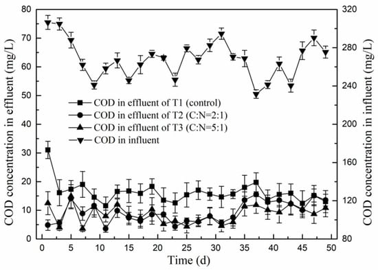 The COD concentration of the first stage influent was 268.3 ± 20.0 mg/L. This reduced during the first stage to 22.8 mg/L, 24.5 mg/L and 20.5 mg/L for effluent of T1, T2 and T3 respectively, so the mean fraction of removed COD reached up to 90% in all three experiments. However, the mean concentration of NO3−-N in the first stage effluent remained above 48.3 mg/L, resulting in a C/N ratio in the first stage effluent below 1. The effect of increasing this ratio to 2 and 5 in T2 and T3, respectively, on COD removal is shown in Figure 6. Whereas the mean concentration of COD in the second stage effluent of T1 decreased to only 16.2 mg/L, for T2 and T3 it went down to 9.3 mg/L and 8.7 mg/L respectively. Compared with T1, the mean COD concentration in the second stage effluent of T2 and T3 were much lower, indicating that the addition of glucose to the second stage influent had not resulted in an increase of COD in the effluent, but rather promoted the removal of COD during the second stage. Clearly, this external carbon source enhanced the activity and growth of denitrifying bacteria. The amount of glucose required for this was not fully met under experimental condition T2, as the best COD removal was obtained with T3, which received the highest amount of glucose. In another study, Chen et al. [] found that the removal efficiency of COD could reach up to 85% in the nitrifying section of CRI, while Wang et al. [] determined an optimal C/N ratio for denitrification of 6–7 when they used glucose as external carbon source. Zhang [] noticed that nitrogen could be completely removed in SBR by adjusting the C/N ratio to 7.1 with added glucose. Yan et al. [] reported that if the main purpose of the sewage treatment was to remove nitrogen, the C/N ratio in influent should be slightly lower than the optimum C/N ratio, which could not only guarantee high COD removal rates (resulting in low residual organic matter), but also produce a better nitrogen removal performance.