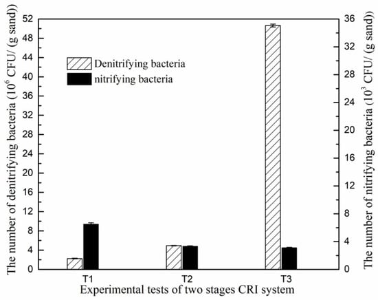 The bacteria in the water-saturated denitrifying section were quantitatively analyzed by the MPN method (Figure 7). The sand from the second stage of T1 contained 6.5 × 103 CFU (g sand)−1 nitrifying bacteria, and approximately half were present in the sand of T2 and T3 (3.3 × 103 and 3.1 × 103 CFU·(g sand)−1, respectively). The low amount of dissolved oxygen and NH4+-N in the fully submerged second stage most probably limited the growth of these aerobic bacteria []. These relatively low counts of nitrifying bacteria support the conclusion that the nitrification reaction was restricted in the fully submerged phase of the CRI. A previous study [] described that when organic matter was abundant in sewage, heterotrophic bacteria could grow rapidly and these would outcompete nitrifying bacteria for dissolved oxygen and nutrients.