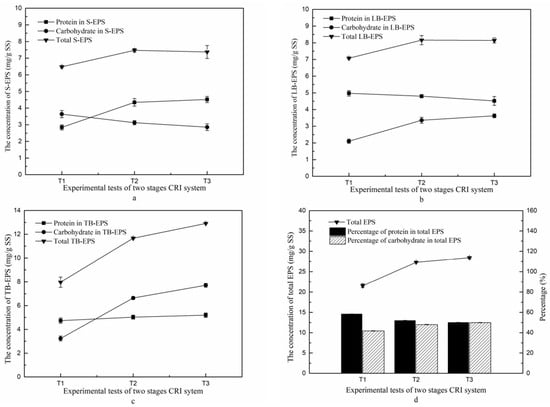 The comparisons of protein and carbohydrate fractions of EPS between T1, T2 and T3 produced a less clear picture, with an increase for proteins as a result of increased C/N ratio in S-EPS and TB-EPS but not in LB-EPS. For the carbohydrate fraction, the trends were in the opposite direction (Figure 8). The reason for these observations may be that as long as the nitrogen source was sufficient in the influent, addition of extra glucose could promote the formation of protein in S-EPS, but this limited the production of carbohydrates due to competition. The fractions of both protein and carbohydrate were increased in TB-EPS when the C/N ratio was increased (Figure 8c), which indicated that the increase of carbon source could simultaneously promote the increase of protein and carbohydrate concentrations in biofilm TB-EPS. Moreover, the contents of protein and carbohydrate in total EPS (Figure 8d) showed the same changing trends as those of TB-EPS, which indicates that increasing the C/N ratio in the second stage influent was favorable to enhance the secretion of protein and carbohydrates in total EPS. This would lead to an improved ability of biofilm formation, which would protect the microbial cells and allow more efficient pollutants removal.