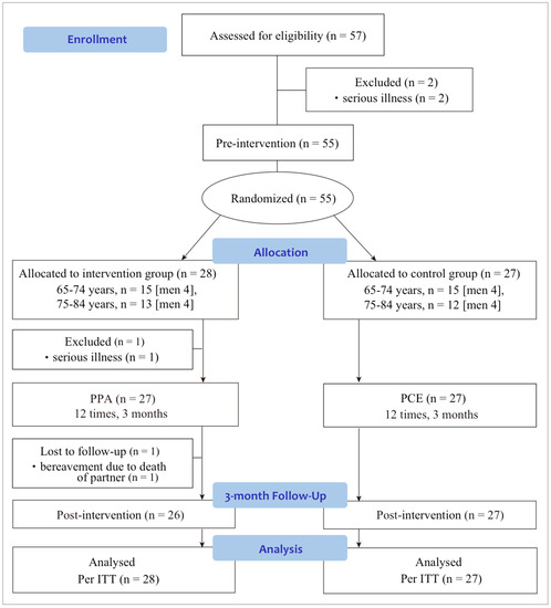 This study used a standardized protocol of a three-month intervention in multiple facilities in the community. The study was a two-arm, non-blind (only analysis was conducted blind), parallel RCT. It was approved by the ethics committee of the National Center for Geriatrics and Gerontology in Japan (No. 935-2), and the protocol was in accordance with the Declaration of Helsinki. Assessments were performed before the start of the PPA program (baseline) and after intervention (follow-up). The study procedure flow diagram is shown in Figure 1.