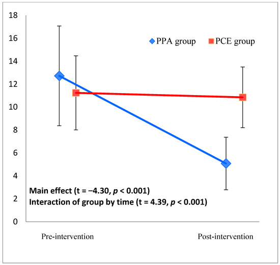 A significant main effect of group (t = −4.30, p < 0.001) and interaction effect of group by time (i.e., differential effect of group by time) (t = 4.39, p < 0.001) were observed, indicating a significant improvement in the CES-D score in the PPA group compared with the PCE group (Figure 2). The group mean differences ±SD were −7.84 ± 7.21 (difference between pre-intervention and post-intervention scores; 4.88 ± 4.55–12.72 ± 8.71) for the PPA group and −0.2 ± 4.98 (11.04 ± 5.42–11.24 ± 6.46) for the PCE group, with an effect size of Cohen’s d = 1.23 (p < 0.001). The sample size calculated based on the effect size was n = 15. Since the sample size was sufficiently large, we performed additional sub-group analyses.