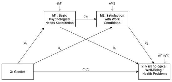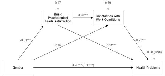3.3. Multiple Partial Mediation of Basic Needs Satisfaction and Satisfaction with Job Conditions in the Gender Effect on Health Problems