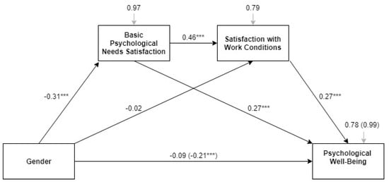 3.2. Multiple Partial Mediation of Basic Needs Satisfaction and Satisfaction with Job Conditions in the Gender Effect on Psychological Well-Being