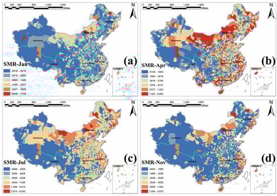 3.5. Estimated Spatiotemporal SMR Maps