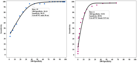 | Cut-Off (cm) | Sensitivity (%) | Specificity (%) | Sensitivity (%) | Specificity (%) |