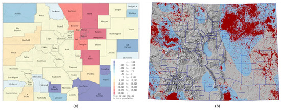 (a) Total population growth by county in Colorado (Data Source: Colorado State Demography Office, Department of Local Affairs (2018). Births, Deaths and Migration—Total Population Change 2008–2018. Retrieved from https://demography.dola.colorado.gov/ ComponentsOfChange) (b) oil and gas wells (red dots) in Colorado as of June, 2018 (Data Source: Colorado Oil and Gas Conservation Commission).