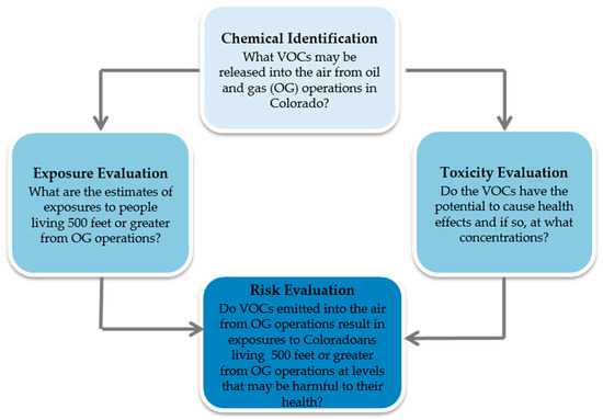 Health risks from the VOCs emitted from OG operations are determined, in part, by the type and amount released into the air that could result in an exposure to someone living near these operations. There have been only a few studies quantifying the community level health risks of VOCs measured near OG operations or in OG regions in Colorado and other states. Some studies have been site specific while others were a broad evaluation of ambient air measurements [37,38,39,40,41,42]. Overall, the findings have shown mixed results. The generalizability of these studies to assess the potential for broad public health effects from VOCs to people living nearby these OG sites is limited, in part, due to varying factors, including small sample sizes, variability in geological formations, different operational processes across companies and regions, and significant changes in emissions regulations over time in Colorado. Recently, McKenzie et al. evaluated air monitoring datasets collected in the northern Front Range area of Colorado. The findings from McKenzie et al. suggested that health risks from air concentrations of VOCs increased as distance from an OG site decreased [37]. From a public health perspective, it is essential to evaluate all existing evidence, identify high priority VOCs that warrant further evaluation and identify key research areas where further data are needed to make sound, scientific risk management and public health decisions regarding health risks to people living outside current state setback distances from OG operations in Colorado. The objective of our study was to compile and conduct an exposure based screening level risk evaluation to determine the adequacy of existing ambient air data answer the following the question: Do VOCs emitted into the air from OG operations result in exposures to Coloradoans living at or greater than current state setback distances from OG operations at levels that may be harmful to their health? Four questions framed the scope of each step in the assessment (Figure 2).