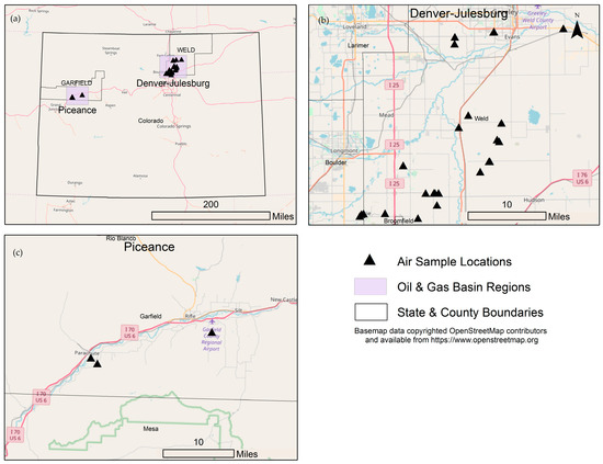 Figure 3. Air sample collection locations (a) within the two major oil and gas basins in Colorado, the (b) Denver-Julesburg Basin and (c) Piceance Basin. Table 1 provides details on individual air datasets. - Samples collected at heights that would generally represent ambient ground-level exposures. Aircraft measurements of VOCs were excluded. However, lower level stationary tower measurements (22 m) such as Swarthout et al. [19] were included.
