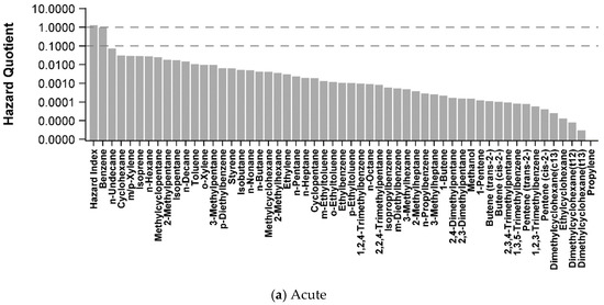 All air concentrations of individual VOCs were below acute and chronic non-cancer HGVs (HQ < 1) (Table 3, Figure 4). Of all 56 VOCs, benzene and n-nonane exceeded a chronic HQ of 0.1. The maximum level of benzene across all studies (8.6 ppb) approaches the acute HGV (9 ppb). Approximately 20% of the VOCs were about 60–100 times lower than their respective acute or chronic HGVs (HQ between 0.06–0.01). All other VOCs were 100–10,000 times lower (<0.01 in Table 3) (Figure 4). Combined hazard estimates for all VOCs were slightly above one for acute (HI = 1.2) and chronic (HI = 1.3) exposures (Figure 4). Only two of the VOCs are classified as known (benzene) and possible (ethylbenzene) carcinogens by IARC. Lifetime excess cancer risk estimates for benzene ranged between 1.0 × 10−5–3.6 × 10−5 and ethylbenzene was 7.3 × 10−6 (Table 4).