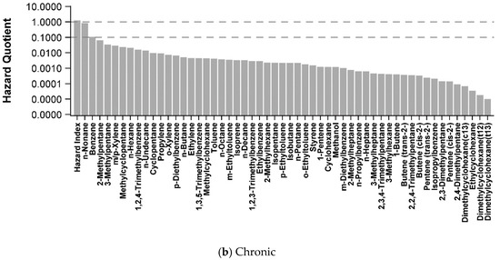 For this screening evaluation, we defined a chronic exposure as a scenario in which a person breathes the outdoor air continuously (24 h per day, 365 days per year) for a lifetime (i.e., 70 years) and the measured concentrations of the VOCs in the air remain constant over the entire lifetime [48,49]. Although drilling, hydraulic fracturing and flowback usually last days to several months and represent more sub-chronic rather than chronic exposures, we conservatively assumed all exposures could be chronic. Production may last 20–30 years and therefore, chronic exposures are possible.
