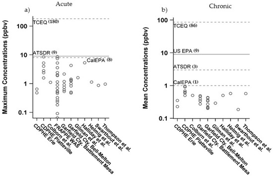 Comparison of distribution of (a) maximums and (b) means of air concentrations of benzene across all air data sampling studies to various agency derived (a) acute and (b) chronic health guideline levels (HGVs). See Table 1 for details of each study. Solid line represents the value chosen for this assessment. Brackets indicate the agency derived HGV.