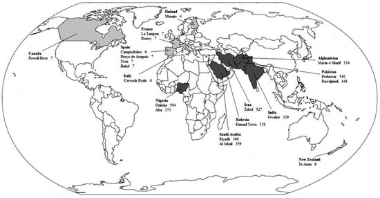 PM10 annual means by the 10 cleanest and 10 dirtiest cities. Countries with the cleanest cities are in light gray. Countries with the dirtiest cities are in dark gray. Adapted from the WHO data on the average annual concentration of PM10 per city (data from http://www.who.int/phe/health_topics/outdoorair/databases/en/) [14].