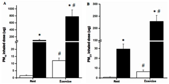 Inhaled PM10 (panel (A)) and PM2.5 (panel (B)) during 30 min at rest and exercise by city category: cleanest (white bars) and dirtiest (black bars). * Significantly different from rest at the same city category (cleanest or dirtiest); # Significantly different from the same situation (rest or exercise) at different city category (p < 0.05).