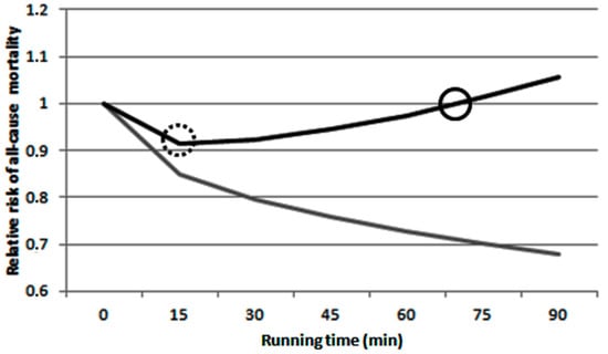 The results of relative risk of all-cause mortality analysis are presented in Figure 4. It was observed a tipping point at 15 min of running, and a break-even point at 75 min of exercise only in the dirtiest cities. For cleanest cities, no relative risk transition points were observed.