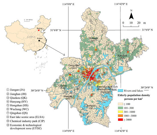 Wuhan is the capital of Hubei province, which is located in central China and is a strategic pivot city for the region. Wuhan is one of many major cities in the Yangtze River delta and is also the core city of the National Central City and the Yangtze River Economic Belt. Because of its key role in domestic transportation, Wuhan is known as the “thoroughfare to nine provinces” in name and in fact and has been awarded the name “the Chicago of China” [40]. Wuhan consists of 17 administrative districts, including 7 central urban districts, 6 new urban districts and 4 development zones. Moreover, 3493 URAUs are divided up based on the current urban and rural grassroots management system, and these units include 1392 urban communities and 2101 villages. Figure 1 shows the elderly population density of the URAUs in Wuhan city in 2016.