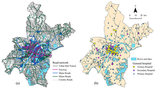 Figure 2. Road network (a) and location of selected general hospitals (b) in Wuhan city. - Road network data included urban rail transit, freeways, major roads, minor roads and country roads. As shown in Figure 2a, a vector road network data of Wuhan was built up after topology checking. The average speed set for different road types refers to the Code for Design of Urban Road Eengineering (CJJ37-2012), which is one of the national standards of China. Table 1 shows the speed stability and characteristics of different kinds of roads in Wuhan, China.