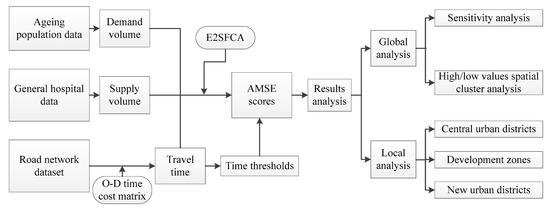 First, the medical service’s demand and supply volume were extracted from the ageing population data and general hospital data, respectively. Second, assuming that the automobile (i.e., driving or taking a car) and urban rail transit were the two optional means of transportation for elderly people in Wuhan to obtain medical services, the travel time was calculated by the O–D time cost matrix based on the road network analysis in ArcMap 10.3 (ESRI, 380 New York Street, Redlands, CA, USA). Next, the AMSE scores were calculated using E2SFCA after the catchment area was defined. Last, global and local analyses were conducted to comprehensively illustrate the spatial differences of AMSE scores in the results analysis part. The global analysis included two dimensions: sensitivity and high/low value spatial cluster analysis. In addition, the AMSE scores of three regional areas were used as an internal comparison in local analysis. The process flow of our research is shown in Figure 3.