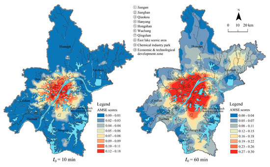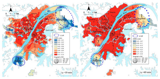 When t0 = 60 min, the AMSE scores in the majority area of central urban districts were generally at a higher- or the highest level (i.e., the scores were 0.12–0.30), and the internal differences were small. However, there were four LVPs in the marginal area. Similarly, the biggest plaque was mostly distributed in Qingshan district and the second was located in the south of Hongshan district. The difference was that Hangyang district has two LVPs, in which the AMSE scores were at a higher level.