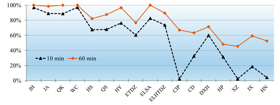 To differentiate accessibility within a catchment, two threshold travel time zones within each catchment were obtained using the ArcGIS Network Analyst. The “Platinum Ten” is a concept familiar to all types of emergency rescue and ambulance crews and is the period during which emergency crews, upon their arrival at the scene, assess the situation and initiate treatment and transport of casualties. The “Golden Hour” has been employed in rescue for more than two decades. It is the hour that you have to get someone to advanced medical treatment in order to increase their chances of survival [45,46]. In this paper, two important emergency first aid times (i.e., 10 min and 60 min) were used as the threshold travel time.