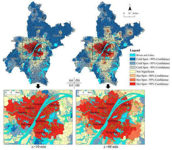 Hot spot Analysis of urban-rural resident autonomous units (URAUs) for Wuhan; (a,b) is the map in the global perspective as threshold time t0 = 10 min and t0 = 60 min correspondingly; (c,d) is the central urban area in an enlarged view with threshold time t0 = 10 min and t0 = 60 min correspondingly.