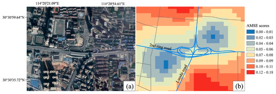 (b) A small LVP of AMSE scores occurred near an overpass located at the intersection 2nd ring road and Luoshi road in Hongshan district as t0 = 10 min; the image in (a) was extracted from Google Earth.