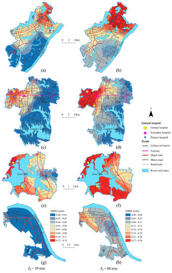 The spatial differences of AMSE scores in development zones were obvious. Specifically, the AMSE scores in the north ETDZ were significantly higher than that of the south. The reason is that the roads in the north are more developed than in the south, and the north has a higher road density. In addition, several primary hospitals are concentrated in the north, while only one primary hospital is located in the south. As shown in Figure 9a,b, the AMSE scores in ETDZ are generally at a lower or lowest level, except for a small part of the north, which had a medium level as t0 = 10 min, and the AMSE scores were generally at a medium-and above level at t0 = 60 min. The AMSE scores in north-west East lake high-tech development zone ELHTDZ were significantly higher than in other areas because general hospitals are mainly distributed in the northwest, the road network is dense and the traffic is convenient. As is shown in Figure 9c,d, the AMSE scores in ELHTDZ were generally at a lowest level at t0 = 10 min; specifically, the elderly people lived in the URAUs far from the general hospitals, where it is difficult to get medical services within 10 min. Meanwhile, the AMSE scores in ELHTDZ were generally at a medium- and-above level at t0 = 60 min; however, fringe areas in the east, such as those on the east coast of Liangzi lake, are places where it is still difficult to conveniently obtain medical services. Compared to other development zones, East lake scenic area ELSA generally has the highest level of AMSE scores. This finding is observed primarily because ELSA is close to the central urban area where medical services are convenient to access, and two tertiary hospitals can provide a large number of medical services. As is shown in Figure 9e,f, the AMSE scores in ELSA were generally at a medium- and-above level at t0 = 10 min, and at a higher- or the highest level at t0 = 60 min. The level of AMSE scores in CIP is generally low. It is difficult for the elderly to obtain medical services effectively, mainly because CIP is far away from the central urban area and contains few general hospitals. As shown in Figure 9g,h, the AMSE scores of CIP were generally at a lower- or medium level at t0 = 60 min, and showed an obvious increase compared to that of t0 = 10 min.