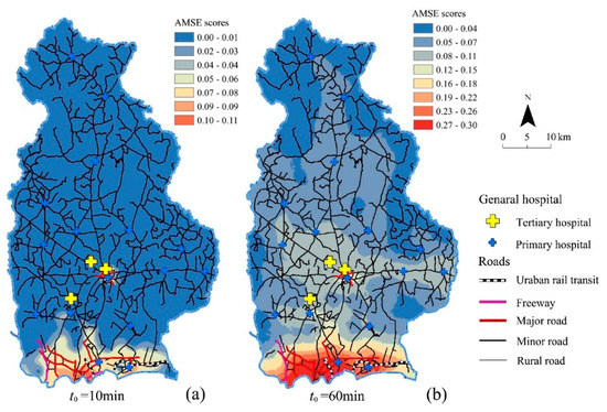 In this study, the AMSE scores were calculated using several static average speeds, Table 1 shows the different road types were divided into two categories: stable and unstable speed roads. However, traffic conditions in 24 h or holiday seasons are quite different, namely the changeable car travel time will lead to the instability of the AMSE scores. For example, the AMSE scores in some part of central urban areas may decrease in rush hours (e.g., 7:15 a.m.–8:45 a.m. and 17:05 p.m.–19:00 p.m.) and then it will increase in normal hours. Despite ambulances having priority access through intersections, the time would increase because some roads usually have traffic congestion in rush hours and car accidents may occur occasionally. Therefore, in future studies, dynamic analysis of AMSE scores is also needed by dividing the time into several categories.