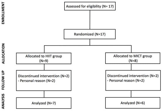 Initially, 17 male subjects who met the inclusion criteria, participated in this study. The inclusion criteria were: (a) to be male adults, aged between 20 to 40 years, (b) to be able to do cycling exercise, and (c) to be physically inactive for last six months. Physically inactive adults were defined as individuals who did not meet the physical activity recommendations of 150 min/week of moderate-intensity exercise []. Any subjects who had knee and/or lower back pain or any cardiovascular- related diseases were excluded. The eligible subjects were randomly assigned to either HIIT or MICT group. During the intervention period, four subjects dropped out due to personal reasons. Therefore, thirteen subjects (HIIT, N = 7, MICT, N = 6) completed the study (Figure 1). This study was approved by the institutional review board (IRB) of the University, and written consent form was obtained from each subject. The characteristics of subjects are presented in Table 1.