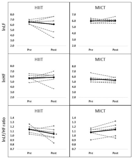 Changes in frequency domain variables from pre- to post-tests. Note: Significant interaction effect for group by time on lnLF/HF ratio was observed where HIIT group only decreased from pre- to post-tests (p < 0.05), Dash line indicates the individual score while solid line indicates the average score in the HIIT and MICT groups.