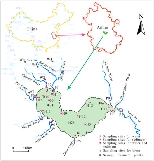 Chaohu Lake, a typical shallow lake, is one of the five largest freshwater lakes in China with a mean depth of 2.69 m and a surface area of 770 km2 []. The lake (E117°16′54″~E117°51′46″, N31°25′28″~N31°43′28″) is situated on flood plains between the Yangtze River and the Huaihe River. More than 9.1 million people live in the Chaohu Lake basin. In the whole basin of Chaohu Lake, there are 33 rivers connected to the lake. More than 90% of the total inflow is supplied by nine major inflowing rivers, including Hangbu River, Fengle River, Nanfei River, Baishishan River, Pai River, Shiwuli River, Zhao River, Zhegao River, and Shuangqiao River. Among them, Hangbu River is the largest river in Chaohu Lake basin by volume and contributes to 65% of the total inflow. The Yuxi River is the only outflowing river linking Chaohu Lake and Yangtze River. As a flowing lake, the riverine runoff is considered to be one of the important routes for the transport of contaminants to Chaohu Lake. Because of the increasing human activities in the lake basin in recent decades, Chaohu Lake has suffered from serious pollution and eutrophication. Recently, various classes of contaminants have been detected in the water, suspended particulate matter (SPM), and sediment of the lake []. However, few studies have focused on the comprehensive investigation on PBDEs in Chaohu Lake basin, including Chaohu Lake, the outflowing and inflowing rivers, and sewage treatment plant effluents, especially for the bioaccumulation and human health risk of PBDEs in this area.