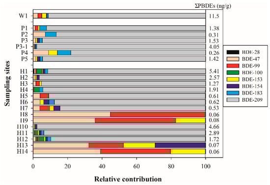 As shown in Table S10 and Figure 3, four PBDEs (BDE-47, BDE-99, BDE-153, and BDE-209) were widely detected in the surface sediment of Chaohu Lake, with respective detection rates of 92.9%, 78.6%, 78.6%, and 71.4%. The mean concentration of Σ8PBDEs ranged from 0.06 to 5.41 ng/g at all the sampling sites, whereas H8, H9, H13, and H14 presented significantly lower levels (0.06–0.08 ng/g) than other sites, followed by H5, H6, and H7 (0.53–0.62 ng/g). Seven sampling sites are higher than 1 ng/g, which are almost located in the western region of Chaohu Lake. The highest and lowest concentrations of Σ8PBDEs were found at H1 and H8/H14, respectively. H1 is located at the estuary of Nanfei River which passes through Hefei city. H8/H14 is located at the mouth of Yuxi River which is the only outlet of the lake. In addition, in the North of Chaohu Lake (H8, H9, H13, and H14 sites), the sediment was predominately sludge dredged. The mean concentration of Σ8PBDEs from the western region (H1–H4, H10, and H11) of 3.12 ng/g was about 6.5 times higher than that obtained in the eastern region (H5–H9 and H12–H14) of 0.47 ng/g. This indicates that the contamination by PBDEs in the western region of Chaohu Lake is more serious than that in the eastern region. On the whole, the concentration of Σ8PBDEs and BDE-209 in the sediment from the western to eastern region decreased gradually, while relative contributions of other PBDE congeners (excluding BDE-209) increased gradually. It has been reported that BDE-209 can undergo photolytic debromination and metabolic degradation to lower-brominated BDE congeners (e.g., Tetra-BDE, Penta-BDE, and Hexa-BDE) []. Thus, it was possible for BDE-209 to be transformed into less-brominated congeners, such as BDE-47 and BDE-99, by natural sunlight, bacteria, and/or metabolism [].