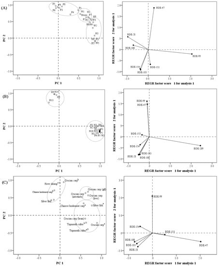 After normalizing by the total concentration, principal component analysis (PCA) was employed for further assessment of PBDEs in the water, sediment, and biota samples from the Chaohu Lake basins. As exhibited in Figure 5A, 87.4% of PBDE variation in the surface water of Chaohu Lake basin could be explained by PC1 (65.5%) and PC2 (21.9%) (eigenvalue > 1). It is distinctive that most of the samples from Chaohu Lake (H3–H9) and samples from the STPs (W2, W3, and W5) were characterized by PC1 with a signature of BDE-99. Also, the majority of samples from the connected rivers (P1, P3–P6, P8, and P9) had higher loading values of PC2 in the component plot and featured BDE-47. Fewer samples from the connected river (P2 and P7), Chaohu Lake (H1 and H2), and STPs (W1 and W4) were correlated positively with both PC1 and PC2. All the above results indicated the same source for the sampling group of inflowing rivers (P1, P3–P6, P8, and P9); for the sampling group of H1, H2, and P2; and for the sampling group of Chaohu Lake (H3–H9). Both BDE-47 and BDE-99 are the major congeners of the penta-formulation of PBDEs.