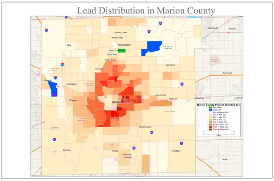 We present results from one such effort to map the urban metal exposome in the city of Indianapolis, Indiana (USA), with a population of about one million people residing the in the heart of the post-industrial Midwest region. Indianapolis is a typical older (>150 years old) city with a substantial legacy of industrialization, manufacturing, and vehicle use, with urban and near-urban residential areas marked by 80–100 year-old single-family dwellings. Indianapolis shares another characteristic of many Midwest cities—high rates of blood Pb poisoning, with >20% of children below seven years old exhibiting blood lead levels above the level of concern (5 microgram/dL) in some of the central census tracts (Figure 1; data from 2005–2015; [26]). The majority of Pb exposure to these children comes from soil Pb, with the mechanism being inadvertent ingestion or inhalation of Pb-contaminated soils and/or dusts generated from soils [23]. Almost no current sources of Pb emissions are present in Indianapolis (as in most U.S. cities), nevertheless the strong footprint of legacy Pb is seen in surface soils, as the geochemical immobility of Pb and the past atmospheric deposition sources from degraded paint dust, automobile emissions, and industrial processes leave patterns that will persist for centuries without remediation [14]. The aim of this paper is to show how citizen science can be utilized to better constrain the geochemical fabric of human impacts on a typical city, in order to catalyze action in those areas where environmental quality is poor.