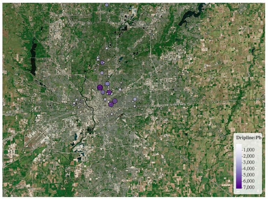 A unique aspect of this study is that the majority of the samples were collected by “citizen scientists” under the Healthy Cities Project (http://kheprw.org/healthy-cities-project/). Citizen science is research conducted by amateur scientists, and is sometimes described as “public participation in scientific research” (e.g., [19]). In this project, the soil samples were guided by a soil Pb awareness and safety handbook, with instructions for sampling locations including a diagram of a typical home that defines the dripline (i.e., within one meter of the side of a home), the street side (within one meter of the edge of a road or sidewalk adjacent to a road), and the yard. We also provided instructions on how many samples to take (one dripline sample, one street side sample, and up to three other yard samples), sample collection (aggregate samples of approximately the top 10 cm), and sample storage (new zip-type plastic bags), in a manner similar as that employed in other settings (e.g., [17,27]). The geochemical analyses were performed at the Biogeochemistry and Health Core Facility at Indiana University-Purdue University Indianapolis (IUPUI), as described in the Methods, and the results and recommendations were returned to the citizen scientists. A total of just under 2000 samples were analyzed from approximately 500 residential properties (Figure 2), broadly covering the city. The program is ongoing, with a particular focus on youth activation and science communication.