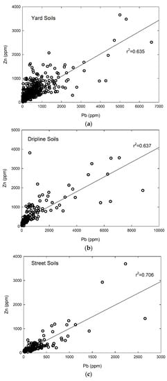 Correlation plots of lead (Pb) and zinc (Zn) for all soil location types. (a) Yard soil, (b) dripline soil, and (c) street soil. The similar slopes for each setting, the strong correlation between them, and their relative enrichment over average soil indicate a strong anthropogenic source impacting their distribution in urban soils.