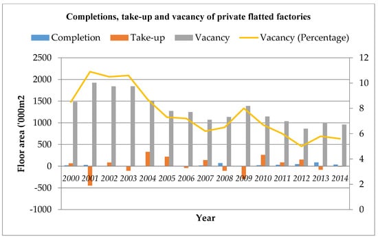 Completions, take-up, and vacancy of private flatted factories (2000–2014) (Source: Hong Kong Property Review, 2005–2015).